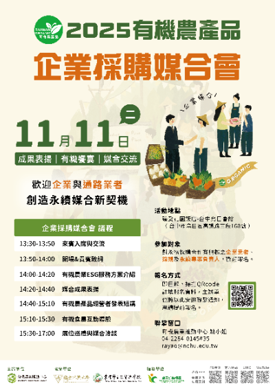 2025-10-13 | 「2025有機農產品企業採購媒合會」歡迎企業報名(報名至2025/11/5)![]() |