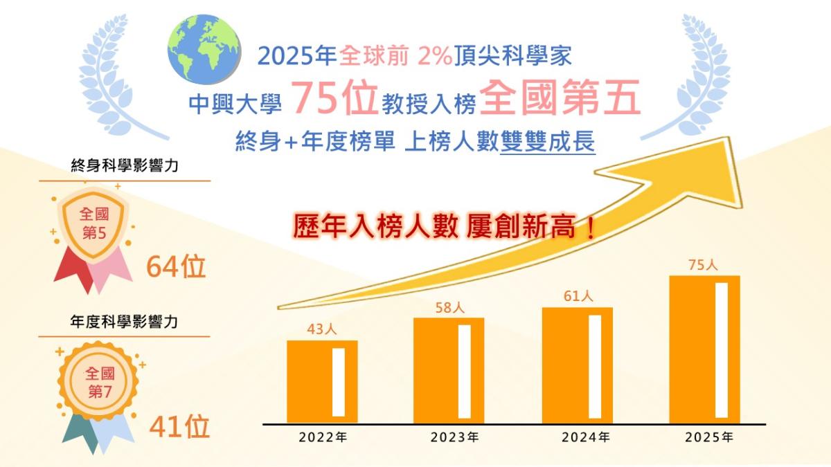 Stanford University has released the latest World’s Top 2% Scientists 2025 list, recognizing researchers with the highest global academic impact. National Chung Hsing University (NCHU) proudly announces that 75 of its faculty members have been named to the list, marking an increase of 14 scholars from last year and setting a new institutional record.