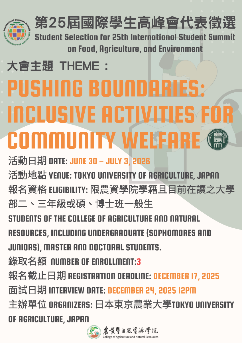國立中興大學農業暨自然資源學院---【實習徵才-截至12月17日】日本東京農業大學-第25屆國際學生高峰會代表徵選