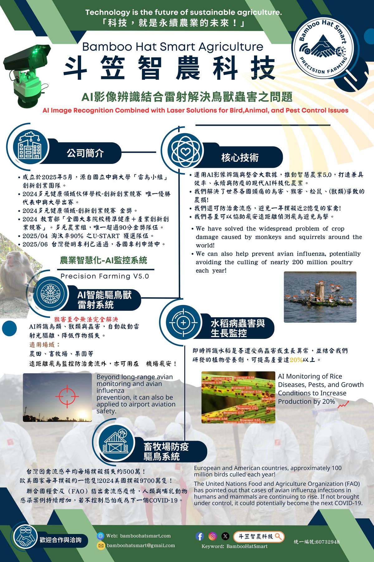 團隊以「智慧科技、永續農業」為願景,開發的AI雷射驅逐系統可即時辨識鳥獸害,並進行精準驅離或擊殺重害蟲,減少農藥使用,提升農作物產量與品質。除農業應用外,技術亦延伸至魚塭防鳥、禽流感防制與機場飛安領域。未來將持續深化AI模型與感測技術,結合友善農業與地方創生,打造兼具科技創新與社會價值的智慧農業新典範。