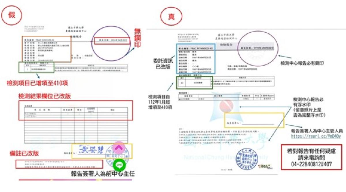 興大農藥殘留檢測中心提醒消費者於網站上查閱產品資訊時,留意辨別農業殘留檢驗報告真實性,消費者若有疑慮,可要求業者出示正本檢驗報告,並留意報告文字上下方線條是否塗改或不連續。